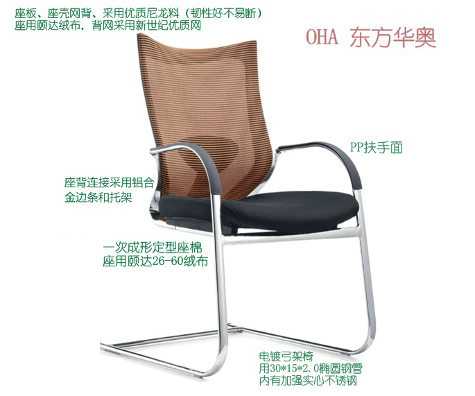 B: PP扶手面,50密度一次成形定型座棉,座板、座殼網背、采用優質尼龍料(韌性好不易斷)座用頤達26-60絨布,背網采用新世紀優質網,OL-2907橙色。